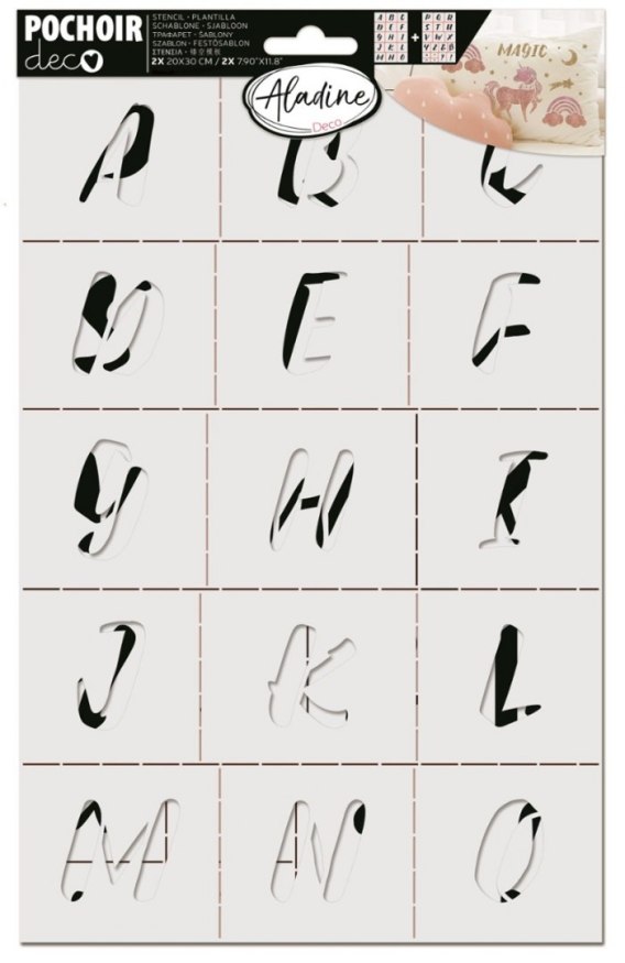 Niesamoprzylepne szablony z cienkiego, giętkiego plastiku. Nadaje się do użytku na tkaninach, papierze (scrapbooking, embossing), kartonie, betonie, drewnie, szkle itp. Można na nim stosować farby akrylowe lub naturalne, kleje, tusze do papieru lub tkanin, pasty strukturalne, farby w sprayu itp. Jeśli nie planujemy pracować na papierze, można na nim zastosować klej do szablonów, aby zapobiec podciekaniu farby pod spód. Szczególnie przydatne jest to w przypadku pracy na tkaninach. Nieodpowiednie dla dzieci w wieku poniżej 36 miesięcy. Wymiary arkusza 30x20 cm, arkusz jest wstępnie ponacinany, aby można było rozdzielić wszystkie litery. Wysokość liter około 3,5 cm. Made in China.