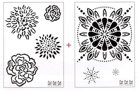 Dwa samoprzylepne szablony z cienkiego, giętkiego plastiku. Klej na szablonach jest niepermanentny, co pozwala przyklejać je do różnych powierzchni i odklejać z łatwością. Równo przyklejone zapobiegają podciekaniu farby pod spód. Nadają się do użytku na tkaninach, betonie, drewnie, szkle itp. Można na nich stosować farby akrylowe lub naturalne, kleje, farby lub tusze do tkanin, pasty strukturalne, farby w sprayu itp. Nieodpowiednie dla dzieci w wieku poniżej 36 miesięcy. Wymiary arkusza 29,7x21 cm, w opakowaniu 2 arkusze z różnymi wzorami. Made in Europe. Używając szablonu pokryte farbą zostaną ciemniejsze przestrzenie (patrząc na pierwsze zdjęcie).
