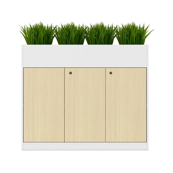 Wielofunkcyjny mebel do open space: górne koryto na doniczki i pojemna szafka poniżej. Zapewnia prywatność między stanowiskami i wprowadza naturalną zieleń, podnosząc komfort pracy i estetykę biura.