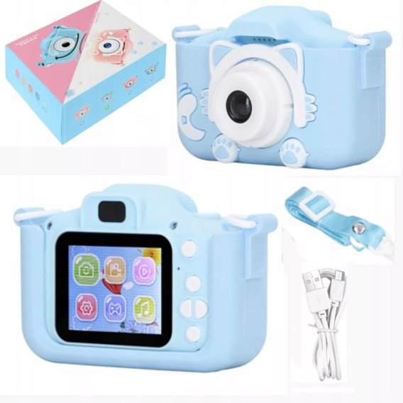 Aparat kamera kotek silikonowa obudowa wyświetlacz gry niebieski smycz X2N