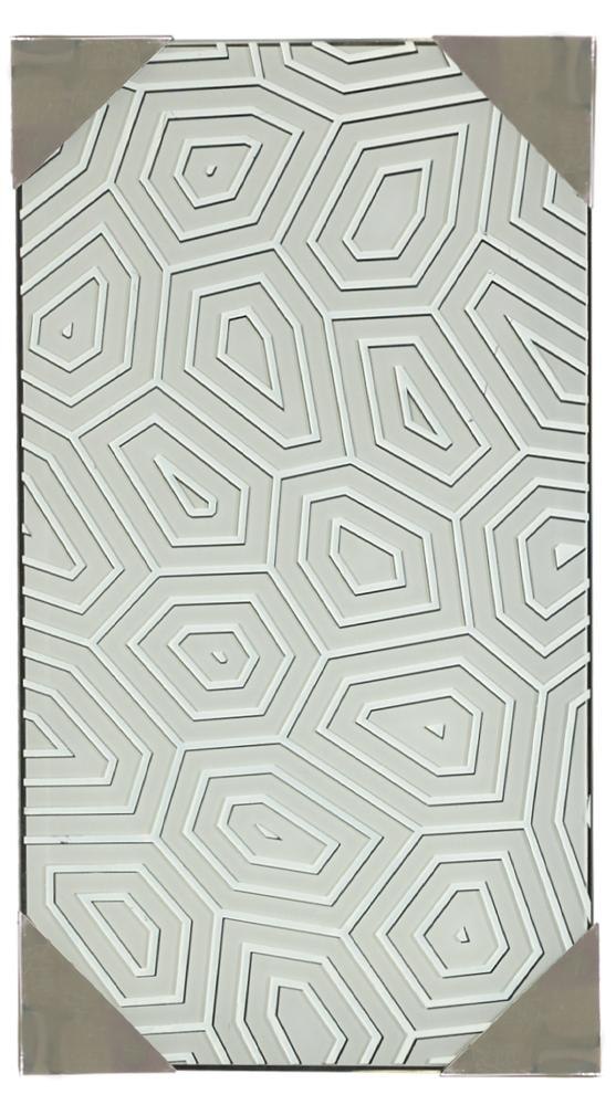 Geometryczne wzory - z efektem lustra -podkreślające modernistyczny charakter plafonu; metalowe narożniki dwufunkcyjne - ozdobne i ochronne; płaski klosz z hartowanego szkła; dostępny w 3 rozmiarach