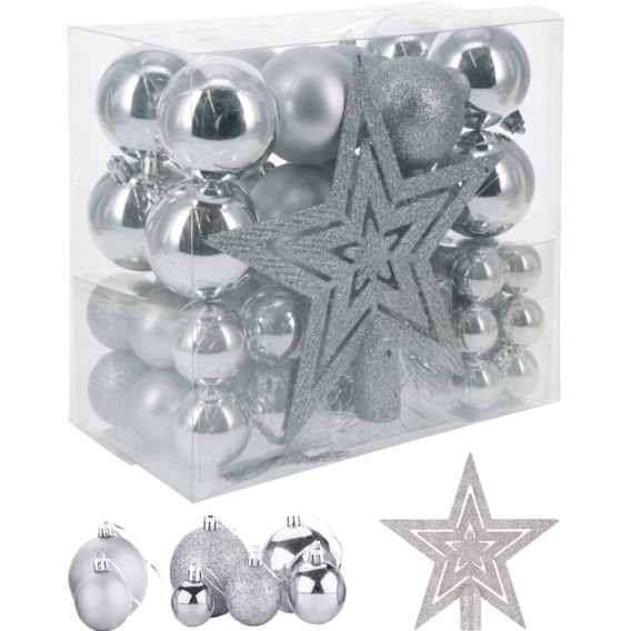 Ozdoby choinkowe mogą mieć różne kształty, mogą być w stylu glamur lub ECO. Te srebrne bombki, czubek i łańcuch pięknie ozdobią Twoje drzewko nadając mu szyku i elegancji.