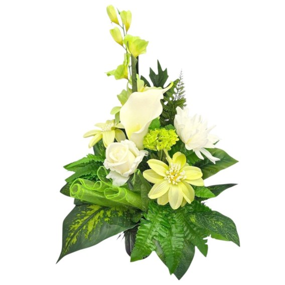 Kompozycje nagrobne z obciążeniem z wysokiej jakości sztucznych kwiatów i roślin.
