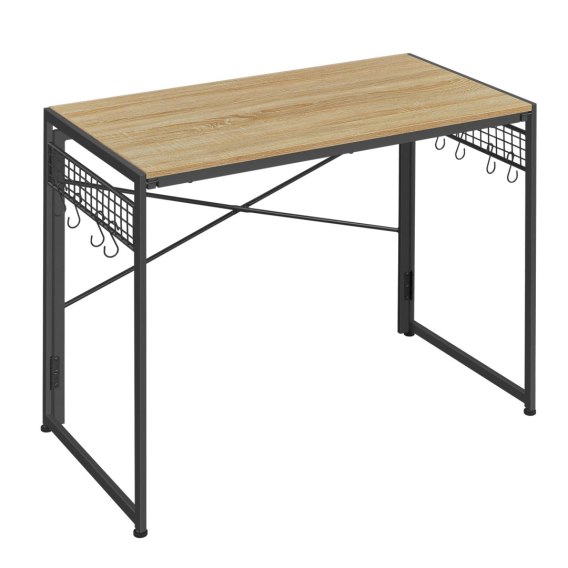 Stylowe biurko w kolorze sonoma jest stabilne, a więc możemy umieścić na nim komputer, monitor, zestaw głośników czy też laptop, drukarkę, lampkę biurkową, książki i zeszyty. Do biurka dołączono 8 haków, abyś miał pod ręką wszystko co potrzebne.