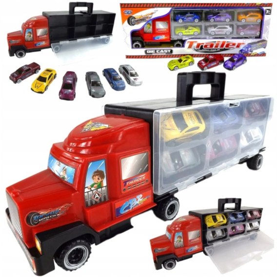 Ciężarówka laweta będzie idealną zabawką dla Twojej pociechy. Ciężarówka posiada otwieraną naczepę w której można schować małe samochody.