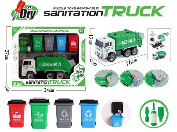 Ciężarówka Auto Samochód Śmieciarka Do Rozkręcania + Zestaw Koszy Na Śmieci