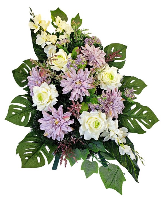 Kwiaty są integralnym elementem ceremonii ostatniego pożegnania lub jako element ozdobienia grobu, łącząc szacunek i elegancję w jednym, starannie wykonanym projekcie. Podkład wieńca jest wykonany z zielonych, gęsto splecionych gałązek PCV, które są zarówno trwałe, jak i estetyczne, podkreślając kolorystykę wiązanki.
