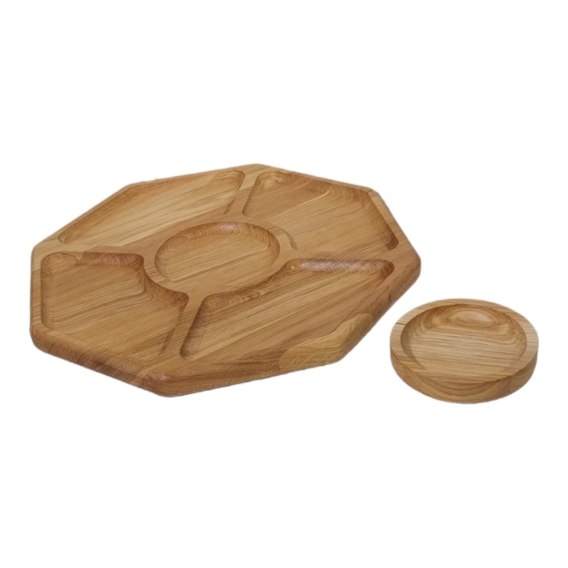 Deska dębowa 4 komorowa do serwowania potraw, serów , wędlin Deska z pięcioma komorami , wykonana z drewna dębowego, idealna do serwowania potraw, serów , wędlin. Do deski jest dołączona miseczka do serwowania sosów.   Skład zestawu: deska miseczka na sosy Wymiary deski: długość  33 cm szerokość  33 cm grubość 2 cm Wymiary miseczki: średnica  10 cm grubość 2 cm