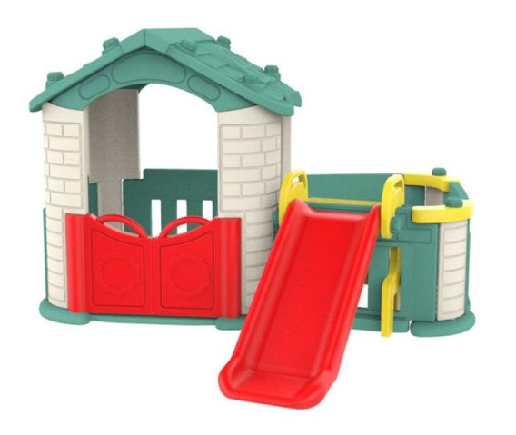 • Domek ogrodowy 3w1 dla dzieci Zielony dach + Zjeżdżalnia + Ogródek z płotkiem