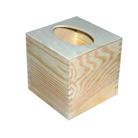 Pudełko jest wykonane z drewna sosnowego, wieczko i dno ze sklejki brzozowej. Na spodzie jest zasuwka, która pozwala na łatwe umieszczenie chusteczek wewnątrz. Pudełko to zostało  zrobione przez polskiego producenta z największą dbałością o szczegóły. Zaprojektowano je do przechowywania chusteczek higienicznych, ale jak Ty je wykorzystasz zależy tylko od Ciebie. Pudełko nie zostało pomalowane, więc idealnie nadaje się do samodzielnego zdobienia np. techniką decoupage ( jest to technika polegająca na przyklejaniu na powierzchni ozdabianych przedmiotów papierowych serwetek, tak aby efekt wyglądał na ręcznie malowane wzory). To pudełko w połączeniu z Twoją wizją stanie się niepowtarzalnym elementem w wystroju Twojego domu, na pewno wzbudzi ciekawość i zainteresowanie Twoich przyjaciół i rodziny. Może też stać się wyjątkowym prezentem dla kogoś bliskiego   Dlaczego warto kupić to pudełko?   Jest to produkt wykonany z drewna, czyli - ekologiczny - nie wywołujący alergii - wytrzymały - uniwersalny (drewno pasuje do każdego wnętrza, prezentuje się idealnie w towarzystwie każdego innego materiału) Jest wyprodukowany w Polsce - kupując ten produkt wspierasz lokalnych producentów - Jakość wykonania jest zdecydowanie wyższa niż produktów z Azji Jest to naturalne drewno - niemalowane - możesz je pomalować i ozdobić według własnego uznania co sprawi że będzie wyjątkowy i niepowtarzalny   CECHY PRODUKTU:   Wymiary  (długość/szerokość/wysokość): - zewnętrzne: 13x13x13 cm - wewnętrzne: 11,3x11,3x11,5 cm Materiał: drewno sosnowe, sklejka brzozowa Kolor:  naturalny drewna - niemalowane Produkt wykonany w Polsce