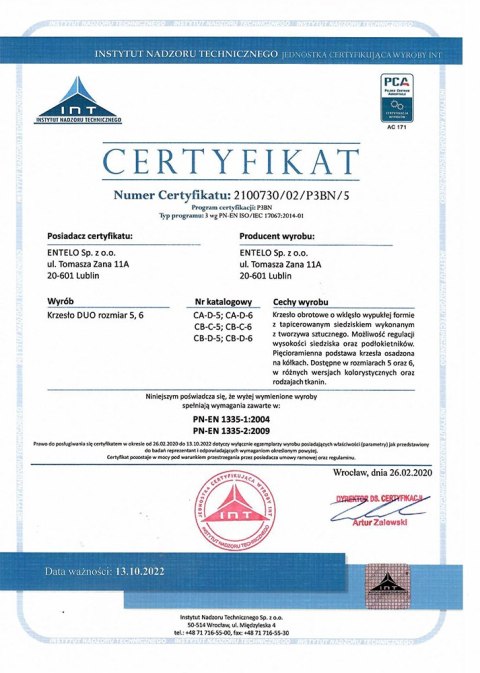 Tworzymy tylko zdrowe krzesła! Liczne badania potwierdzają, że około 70% dzieci w wieku szkolnym posiada błędy lub wady postawy. Dobre Krzesła dostosowane są do wzrostu użytkownika i występują w 4 rozmiarach. Pamiętaj aby odpowiednio dopasować rozmiar krzesła do wzrostu dziecka. Czym są Dobre Krzesła? Dobre Krzesła to linia produktów ergonomicznych, które dzięki posiadanym parametrom oraz najwyższym standardom w zakresie ergonomii sprzyjają wyrabianiu prawidłowej pozycji siedzącej, a w konsekwencji wspomagają prawidłowy rozwój kręgosłupa. Krzesła poprzez wyprofilowanie lordozy lędźwiowej wymuszają obciążenie guzów kulszowych, stymulują prawidłową pozycję miednicy, która jest podstawą właściwego ustawienia górnych segmentów kręgosłupa. Dobre Krzesła zostały zaprojektowane zgodnie z Normą PN-EN 1729 dzięki czemu posiadają rozmiary dedykowane do wzrostu użytkownika. Sprawia to, że w przypadku najmłodszych krzesła mogą „rosnąć" razem z nimi. Krzesło młodzieżowe Duo To linia Dobrych Krzeseł posiadająca parametry ergonomiczne, które odpowiadają za zachowanie prawidłowej postawy siedzącej. Duo występuje w sześciu rodzajach tkanin i trzech kolorach komponentów - czarnym, białym oraz szarym. Wykończenie krzesła oraz szeroki wybór koloru tapicerki sprawia, że model pasuje do każdego wnętrza. Duo dostępne w rozmiarze 5 i 6 posiada regulowane podłokietniki umożliwiające wsunięcie krzesła pod blat biurka. Podstawę krzesła wykonano z tworzywa sztucznego oraz włókna szklanego. W zestawie znajdują się kółka miękkie umożliwiające ruch krzesła zarówno po powierzchniach twardych jak i wykładzinach. Produkt zaprojektowany i wyprodukowany w Polsce. Specyfikacja tkaniny Visto Kolorystyka: czarny, szary, zielony, niebieski, fioletowy, różowy, czerwony, beżowy Kolor przeszyć: biały Kolor lamówki: biały Gramatura: 255 g/m2 Skład: 100% poliester Ścieralność: 45 000 cykli Jak dobrać odpowiedni rozmiar krzesła do wzrostu dziecka? Kręgosłup jako główny stabilizator ciała wymaga wsparcia w okresie dojrzewania, kiedy rośniemy i się rozwijamy. Mając 130 cm wzrostu poszczególne odcinki kręgosłupa znajdują się na innej wysokości niż w momencie kiedy osiągniemy 170 cm wzrostu. Z punktu ergonomii jest to niezwykle ważne, aby krzesło było odpowiednio dopasowane do wzrostu dziecka czy dorosłego. Rozmiary Dobrych Krzeseł są zaprojektowane w taki sposób, aby na każdym etapie rozwoju wspierały kręgosłup poprzez zachowanie krzywizn i uwypukleń , które odzwierciadlają naturalne ułożenie kręgosłupa. Certyfikaty i atesty Tworzenie nowoczesnych przestrzeni i wnętrz to tworzenie przestrzeni bezpiecznych. W tym celu konieczne jest zastosowanie wyposażenia, które nie tylko nie zagraża zdrowiu użytkowników, lecz aktywnie bądź pasywnie wspomaga funkcje ochronne. Produkty przedstawione w naszej ofercie są zaprojektowane zgodnie z powyższą ideą. Produkt posiada certyfikat zgodności z Normą PN-EN 1335-1:2004 oraz PN-EN 1335-2:2009. Ergonomiczne siedzisko wykonane z tworzywa sztucznego Podłokietniki Podłokietniki regulowane wykonane z tworzywa sztucznego, twarde Mechanizm Blacha siedziska z dźwignią prostą wykonana ze stali Kolumna Podnośnik gazowy wykonany ze stali i tworzywa sztucznego Zgodność z Normą EN 1335 Osłonka Teleskopowa osłonka na podnośnik gazowy wykonana z tworzywa sztucznego Baza Podstawa pięcioramienna wykonana z tworzywa sztucznego i włókna szklanego Kółka Kółka miękkie wykonane z tworzywa sztucznego, średnica 50 mm, średnica trzpienia fi 11