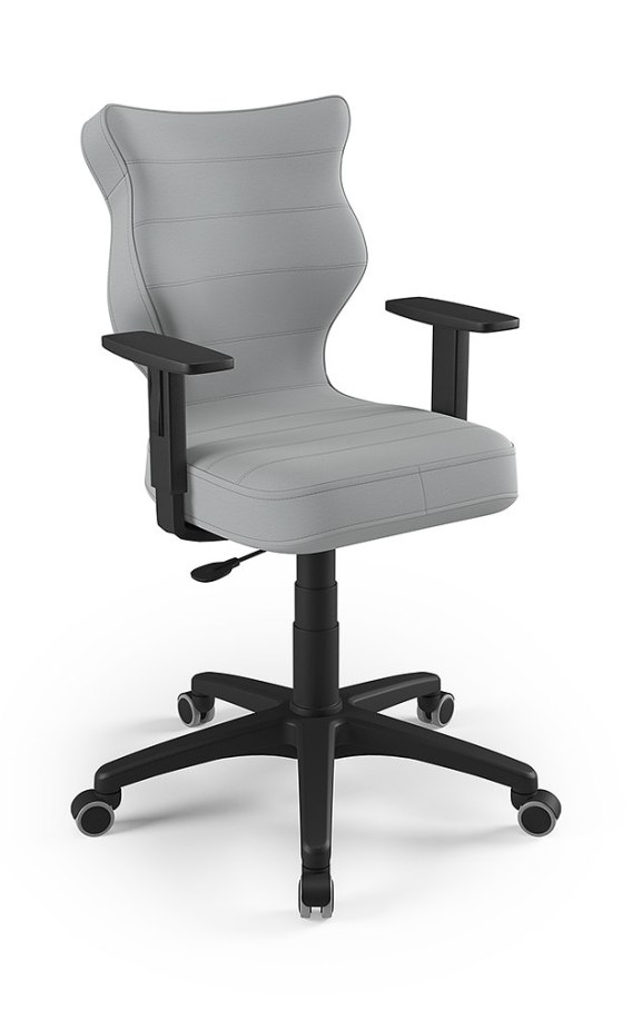 Krzesło do biurka czarne profilowane składa się z siedziska oraz regulowanych podłokietników. Części te wykonane zostały z najwyższej jakości tworzywa sztucznego, które zapewnia trwałość i wygodę użytkowania. Mechanizm podnoszący składa się z blaszanego siedziska, podnośnika gazowego oraz teleskopowej osłonki, która jednocześnie chroni i maskuje urządzenie. Krzesło obrotowe czarne dla młodzieży osadzone jest na pięcioramiennej podstawie o szerokości 640 mm, wykonanej z twardego tworzywa sztucznego oraz włókna szklanego. Kształt i rozmiary podstawy gwarantują stabilność, bezpieczeństwo i wygodę użytkowania. Miękkie kółka o średnicy 50 mm zamocowane są na trzpieniu stalowym przekroju 11 mm, dzięki czemu wytrzymują nawet znaczne obciążenia nie niszcząc przy tym podłogi po której się poruszają. Świetnie sprawdzają się zarówno na twardych powierzchniach, jak i wykładzinach lub dywanach. Czarne krzesło na kółkach posiada wygodne oparcie, które gwarantuje, że plecy będą znajdowały się odpowiedniej pozycji, która nie obciąża kręgosłupa.