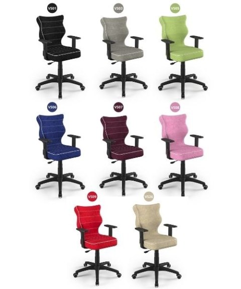 Tworzymy tylko zdrowe krzesła! Liczne badania potwierdzają, że około 70% dzieci w wieku szkolnym posiada błędy lub wady postawy. Dobre Krzesła dostosowane są do wzrostu użytkownika i występują w 4 rozmiarach. Pamiętaj aby odpowiednio dopasować rozmiar krzesła do wzrostu dziecka. Czym są Dobre Krzesła? Dobre Krzesła to linia produktów ergonomicznych, które dzięki posiadanym parametrom oraz najwyższym standardom w zakresie ergonomii sprzyjają wyrabianiu prawidłowej pozycji siedzącej, a w konsekwencji wspomagają prawidłowy rozwój kręgosłupa. Krzesła poprzez wyprofilowanie lordozy lędźwiowej wymuszają obciążenie guzów kulszowych, stymulują prawidłową pozycję miednicy, która jest podstawą właściwego ustawienia górnych segmentów kręgosłupa. Dobre Krzesła zostały zaprojektowane zgodnie z Normą PN-EN 1729 dzięki czemu posiadają rozmiary dedykowane do wzrostu użytkownika. Sprawia to, że w przypadku najmłodszych krzesła mogą „rosnąć" razem z nimi. Krzesło młodzieżowe Duo To linia Dobrych Krzeseł posiadająca parametry ergonomiczne, które odpowiadają za zachowanie prawidłowej postawy siedzącej. Duo występuje w sześciu rodzajach tkanin i trzech kolorach komponentów - czarnym, białym oraz szarym. Wykończenie krzesła oraz szeroki wybór koloru tapicerki sprawia, że model pasuje do każdego wnętrza. Duo dostępne w rozmiarze 5 i 6 posiada regulowane podłokietniki umożliwiające wsunięcie krzesła pod blat biurka. Podstawę krzesła wykonano z tworzywa sztucznego oraz włókna szklanego. W zestawie znajdują się kółka miękkie umożliwiające ruch krzesła zarówno po powierzchniach twardych jak i wykładzinach. Produkt zaprojektowany i wyprodukowany w Polsce. Specyfikacja tkaniny Visto Kolorystyka: czarny, szary, zielony, niebieski, fioletowy, różowy, czerwony, beżowy Kolor przeszyć: biały Kolor lamówki: biały Gramatura: 255 g/m2 Skład: 100% poliester Ścieralność: 45 000 cykli Jak dobrać odpowiedni rozmiar krzesła do wzrostu dziecka? Kręgosłup jako główny stabilizator ciała wymaga wsparcia w okresie dojrzewania, kiedy rośniemy i się rozwijamy. Mając 130 cm wzrostu poszczególne odcinki kręgosłupa znajdują się na innej wysokości niż w momencie kiedy osiągniemy 170 cm wzrostu. Z punktu ergonomii jest to niezwykle ważne, aby krzesło było odpowiednio dopasowane do wzrostu dziecka czy dorosłego. Rozmiary Dobrych Krzeseł są zaprojektowane w taki sposób, aby na każdym etapie rozwoju wspierały kręgosłup poprzez zachowanie krzywizn i uwypukleń , które odzwierciadlają naturalne ułożenie kręgosłupa. Certyfikaty i atesty Tworzenie nowoczesnych przestrzeni i wnętrz to tworzenie przestrzeni bezpiecznych. W tym celu konieczne jest zastosowanie wyposażenia, które nie tylko nie zagraża zdrowiu użytkowników, lecz aktywnie bądź pasywnie wspomaga funkcje ochronne. Produkty przedstawione w naszej ofercie są zaprojektowane zgodnie z powyższą ideą. Produkt posiada certyfikat zgodności z Normą PN-EN 1335-1:2004 oraz PN-EN 1335-2:2009. Ergonomiczne siedzisko wykonane z tworzywa sztucznego Podłokietniki Podłokietniki regulowane wykonane z tworzywa sztucznego, twarde Mechanizm Blacha siedziska z dźwignią prostą wykonana ze stali Kolumna Podnośnik gazowy wykonany ze stali i tworzywa sztucznego Zgodność z Normą EN 1335 Osłonka Teleskopowa osłonka na podnośnik gazowy wykonana z tworzywa sztucznego Baza Podstawa pięcioramienna wykonana z tworzywa sztucznego i włókna szklanego Kółka Kółka miękkie wykonane z tworzywa sztucznego, średnica 50 mm, średnica trzpienia fi 11