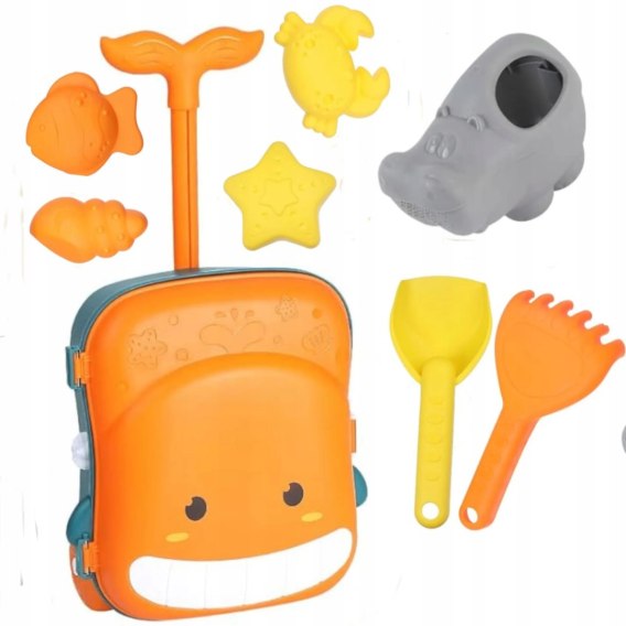 Walizka jest super dodatkiem, dzięki niej dziecko może zapakować ulubione zabawki na plażę i same prowadzić walizkę. Uchwyt walizki jest regulowany. Walizka zamykana jest na zatrzask.
