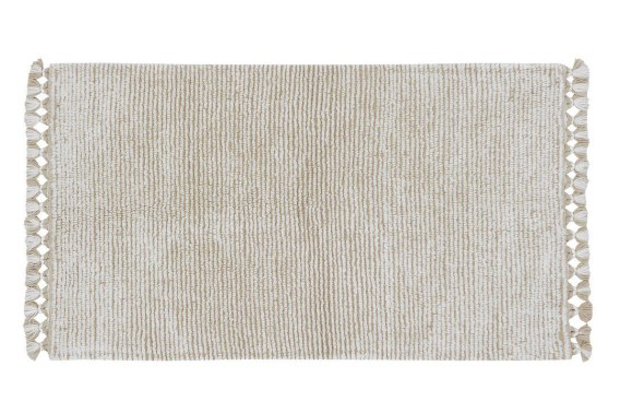 Dywan Koa Sandstone to dwie różne warstwy wełny, których tło jest tuftowane w kolorze piaskowca, a na wierzchu przecinają się cienkie linie w niebarwionej bieli owczej, tworząc subtelny wzór w paski. Oba kolory mieszają się na brzegach w starannie ręcznie plecionych frędzlach. Wymiary: 80x140 cm