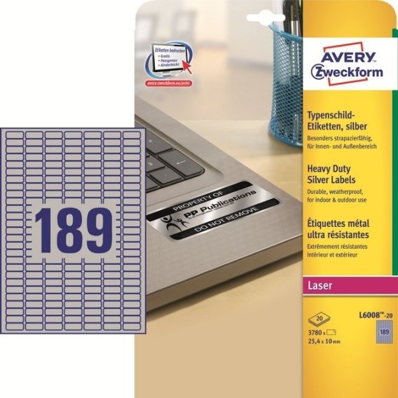 ETYKIETY HEAVY DUTY SREBRNE 25.4 X 10 MM. 189 SZT/A4. AVERY