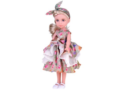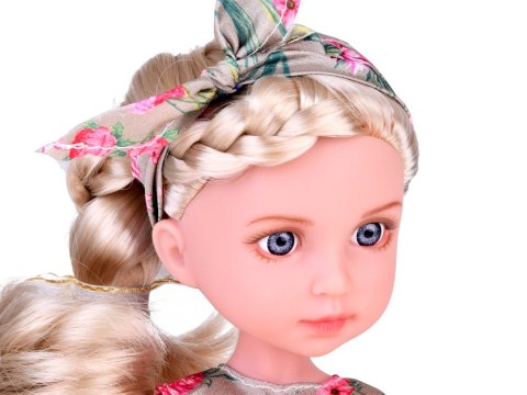 Elegancka lalka w kwiecistej sukience i stylowej opasce na głowie to prawdziwa dama, idealna do towarzyszenia podczas zabawy.