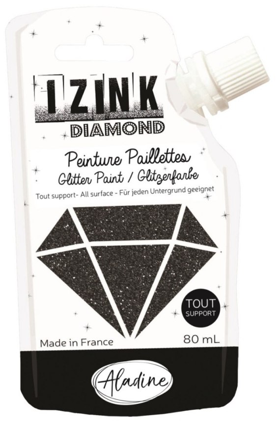 Czarna farba brokatowa. Nadaje się do użycia na każdym rodzaju powierzchni, takich jak drewno, beton, papier, tkaniny, plastik, metal itp. Efekt dekoracyjny jest bardzo wyrazisty dzięki koncentracji brokatu i transparentnej bazie farby. Idealna do spersonalizowania ozdób mieszkania lub ubrań. Można nią malować pędzlem lub nakładać przez szablon. Tubka z miękkiego tworzywa sztucznego nadaje się do recyklingu i pozwala na wykorzystanie farby do ostatniej kropli. Przy ozdabianiu tkanin należy zostawić farbę do wyschnięcia, a następnie utrwalić ją termicznie żelazkiem (ustawionym na temperaturę dostosowaną do rodzaju tkaniny) prasując po lewej stronie (albo przez papier do pieczenia lub cienką ściereczkę) przez 5 minut bez użycia pary. Na butach z tkaniny farbę utrwalić można suszarką do włosów ustawioną na wysoką temperaturę. Po utrwaleniu tkaniny można prać w temperaturze 40 °C. Nieodpowiednie dla dzieci w wieku poniżej 36 miesięcy. Pojemność 80 ml. Made in France.