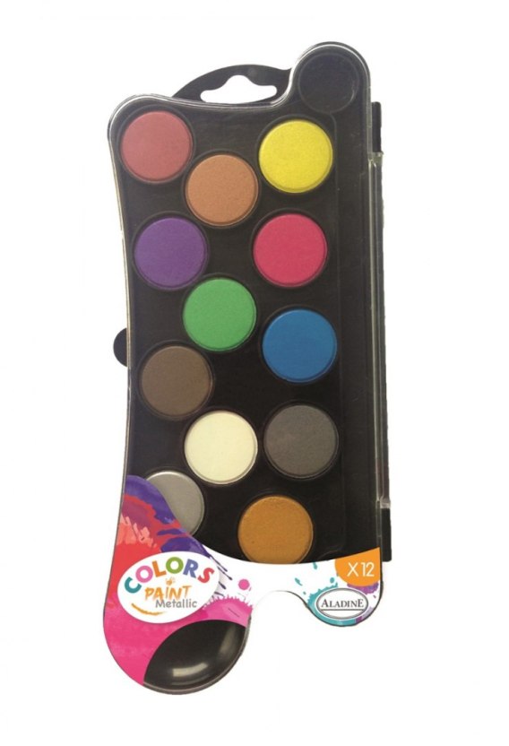 Zestaw farbek plakatowych w 12 metalicznych kolorach. Kształt pudełka pozwala na wygodne trzymanie palety przy malowaniu. Do zestawu dołączony jest pędzelek. Wymiary zestawu: 24,5x11x1 cm. Polecane od trzeciego roku życia. Made in China. Zgodne z europejskim standardem bezpieczeństwa EN71.
