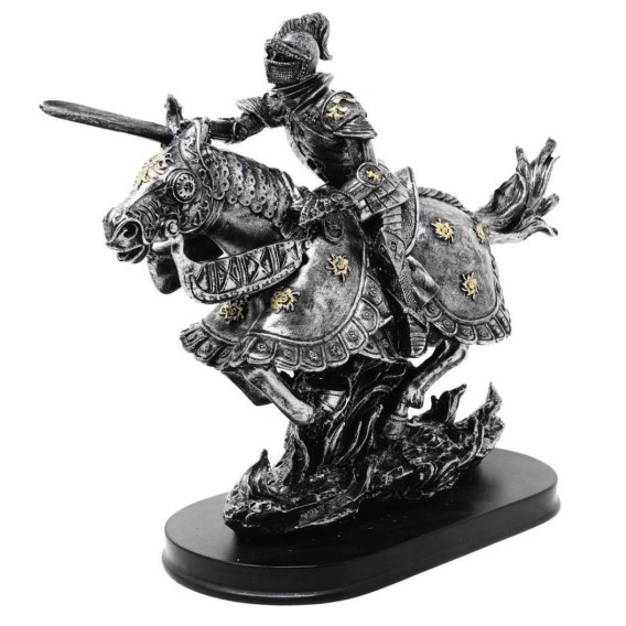 Figurka rycerza na koniu to dekoracja, która przyciąga uwagę i budzi podziw. Przedstawia średniowiecznego wojownika w pełnej zbroi, z mieczem uniesionym do ataku - gotowego do walki. Wykonana z polyresinu, ręcznie malowana w odcieniach postarzanego srebra z delikatnymi złotymi detalami. To świetny wybór dla osób ceniących historię, militaria i męski klimat w aranżacji wnętrz.