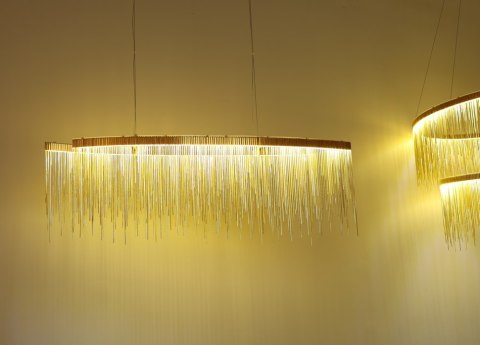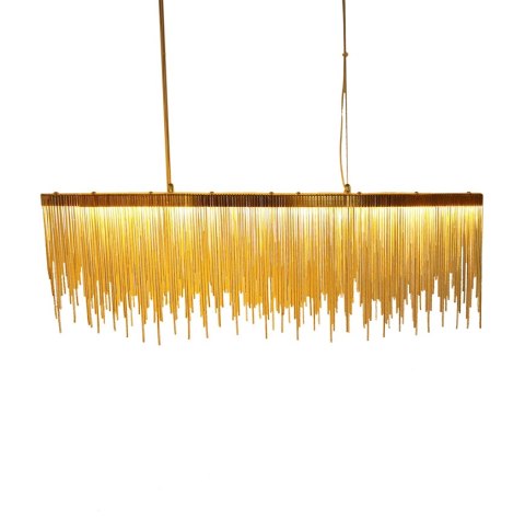 Wyjątkowa, kaskadowa Lampa Wisząca LED o mocy 38W z setkami złotych łańcuszków.
