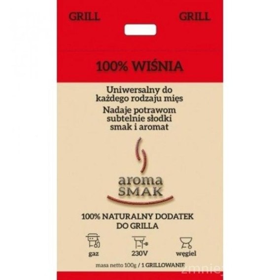 Specjalny, 100% naturalny granulat wyprodukowany ze starannie wyselekcjonowanych odmian drzewa wiśni,Produkt ten nadaje potrawom subtelnie słodki aromat i smak,Uniwersalny do każdego rodzaju mięs, szczególnie polecany do potraw z wołowiny, drobiu i wieprzowiny. AROMA SMAK to naturalny dodatek wyprodukowany w 100% z wyselekcjonowanych odmian drzew liściastych. Drzewo poddane jest obróbce i sprasowane pod dużym ciśnieniem w kontrolowanej temperaturze. Przyjmuje konsystencję granulatu. Dzięki temu procesowi obróbki uzyskano wysokoenergetyczny granulat całkowicie wolny od żywic, kwasów i gazów, które powstają w procesie spalania.Aroma Smak doskonale nadaje się do wędzenia i grillowania, ponieważ dym powstający przy jego spalaniu jest bardzo czysty, aromatyczny i posiada wysoką wartość energetyczną.Podstawowym drzewem występującym w Aroma Smak jest dąb lub wiśnia, który połączony z innymi rodzajami drzew, dodaje dodatkową nutę smakową i zapachową.Nasz produkt posiada Certyfikat czystości GRLE i został wyprodukowany w USA.