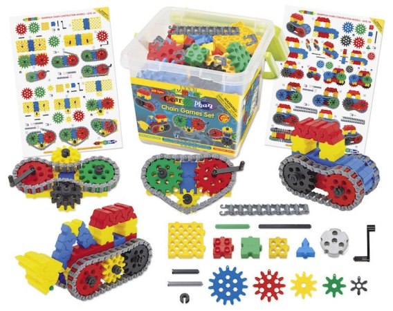 200 elementowy zestaw zawierający 5 wielkości kół zębatych oraz łańcuch do budowy ruchomych konstrukcji. W pudełku ciekawe instrukcje krok po kroku pozwalające poznać możliwości budowy różnych modeli. Całość zapakowana w estetyczne pudełko z rączką.