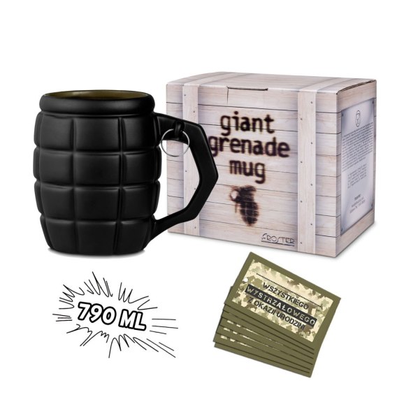Gigantyczny kubek w kształcie granatu to prezent dla kogoś, kto często jest w biegu i nigdy nie ma czasu na tak przyziemne sprawy, jak dolewki i parzenie kolejnej herbaty. Dzięki dużej pojemności pomieści w sobie więcej niż dwie zwykłe porcje napoju, a stylistyka gadżetu doda właścicielowi siły i pokaże innym jego pozycję. Nikt przecież nie zaczepi człowieka z granatem w ręku tylko po to, żeby zawracać mu głowę czymś mało ważnym. ;) Ulubiona kawa i herbata to nie jedyne napoje, które smakują wybornie z Gigantycznego Kubka Granatu. Gadżet ten potrafi również rozładować napięcie po pracy, kiedy to z radością może zmienić się w kufel wypełniony zimnym bursztynowym piwem z pianką lub pysznym grzańcem. Gigantyczny Kubek Granat powinien znaleźć się w domu każdego fana militariów. Podaruj go osobie ambitnej lub takiej, której samodyscyplinę podziwiasz. Może być to szef, przyjaciel, który pomimo trudności losu nie zbacza z wytyczonej ścieżki lub kolega trzymający dietę i morderczy rygor treningowy nawet na wakacjach. Mąż, chłopak czy tata także ucieszą się z upominku, który potwierdzi ich władzę i autorytet. To również fajny pomysł na prezent dla nauczyciela przysposobienia obronnego czy wuefisty słynącego z trzymania dyscypliny na zajęciach.
