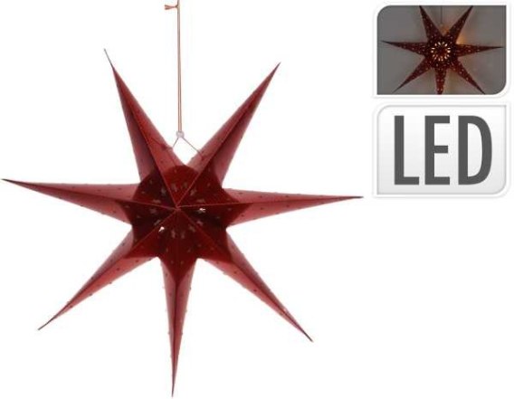 Papierowa gwiazda LED w kolorze czerwonym Duża gwiazda papierowa w przepięknym czerwonym kolorze. Idealnie pasuje do powieszenia nad świątecznym stołem, w oknie, a także na ścianie. Jej delikatne światło wprowadzi przyjemną atmosferę do każdego pomieszczenia. Specyfikacja: papierowa gwiazda z wycięciami w kropki i gwiazdki, wymiary: 60 x 20 x 60 cm, kolor czerwony z wykończeniem z folii, zasilanie 2 baterie AA (nie dołączone do zestawu).