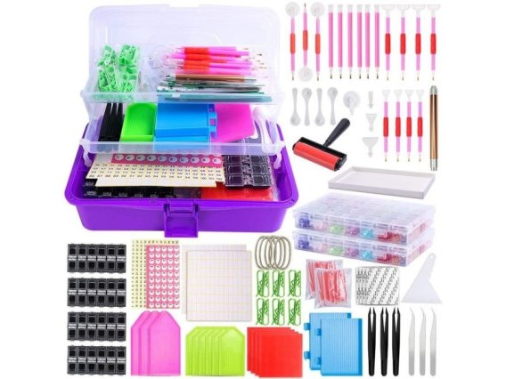 Zestaw dodatkowych akcesoriów do haftu diamentowego, który składa się z wielu przydatnych elementów. Zestaw ten ułatwi i uprzyjemni zabawę w wyklejanie diamencików.