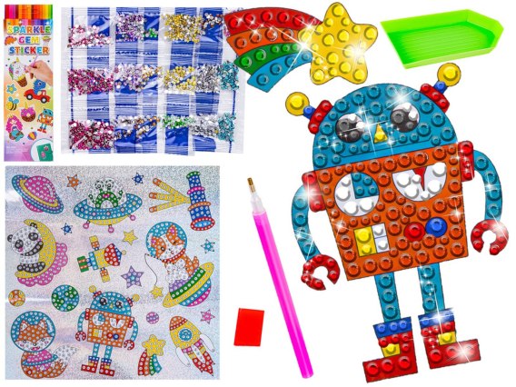 Oferowany zestaw zawiera wszystkie niezbędne elementy do wykonania gotowych układanek w tematyce kosmosu :) Zabawa polega na tym aby odpowiednimi, bajecznie kolorowymi diamencikami wyłożyć pola na naklejkach.