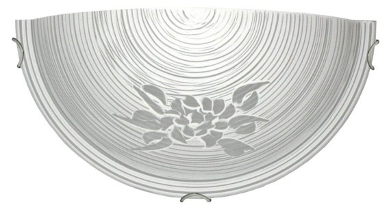 Klasyczny kinkiet z kloszem ze szkła giętego, po całej powierzchni zdobiony oryginalnym wzorem, uzyskanym w procesie produkcji poprzez piaskowanie, polerowanie i malowanie, matowy po stronie zewnętrznej, dodatkowo zdobiony motywem roślinnym, metalowe dekoracyjne uchwyty. Odpowiedni do pomieszczeń w stylu klasycznym, jak również do nowoczesnych pomieszczeń.