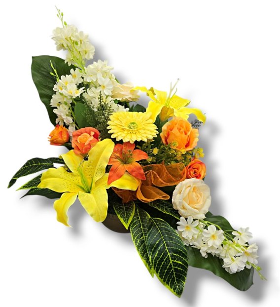 Kompozycje nagrobne z obciążeniem z wysokiej jakości sztucznych kwiatów i roślin.