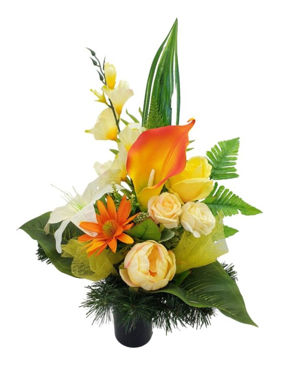 Kompozycje nagrobne z obciążeniem z wysokiej jakości sztucznych kwiatów i roślin.