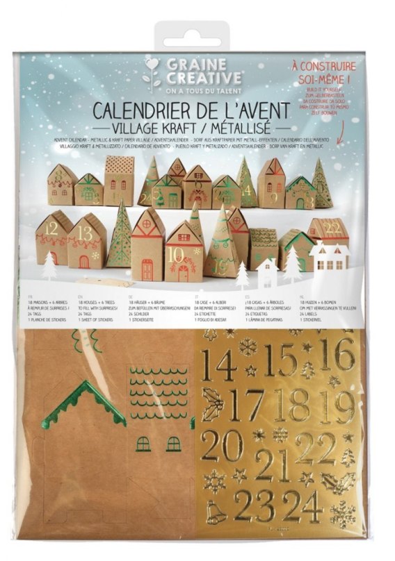 Zestaw składa się z 12 brązowych ekologicznych kartek A4 i jednego arkusza naklejek ze złotymi cyframi. Na sześciu kartkach nadruk jest w kolorze czerwonym metalicznym, a na sześciu kolejnych w zielonym metalicznym. Na kartkach znajdują się precyzyjnie wycięte wzory, które po wyjęciu łatwo złożymy tworząc pudełeczka w kształcie domków (18 szt.) i choinek (6 szt.). Do każdego z nich możemy włożyć całkiem sporą czekoladkę, a z całości ustawimy nastrojową, zimową wioskę. Ponadto wśród wzorów pudełeczek znajdują się 24 tagi.