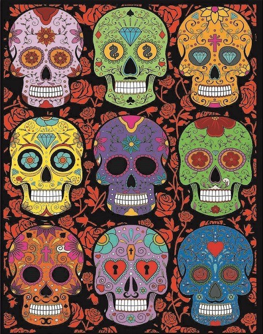 Czaszki - kolorowanka z welwetowymi w dotyku konturami (pokrytymi czarnym welurem). Wypukłe linie ułatwiają nie wychodzenie za linie, a na głębokiej matowej czerni nie widać drobnych potknięć przy kolorowaniu. Welwet nałożony jest na papier przyklejony do sztywnej tektury, dzięki czemu obraz nie wymaga ramki jeśli zdecydujemy się go powiesić na ścianie. Specjalny papier sprawia że kolory są bardziej intensywne. Można kolorować flamastrami, kredkami, temperami, wszystkim co pisze po papierze. Można stworzyć rewelacyjne efekty za pomocą cieniowania. Rozmiar arkusza 47x35 cm. W zestawie 12 flamastrów z filcowymi końcówkami. Nieodpowiednie dla dzieci w wieku poniżej 36 miesięcy. Made in Italy.