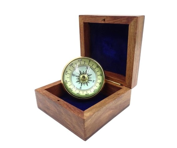 Kompas Soczewkowy, który świetnie sprawdzi się jako przycisk do papieru. Soczewka sprawia, że kompas wygląda jakby unosił się w wodzie. Powiększa też tarczę kompasu.