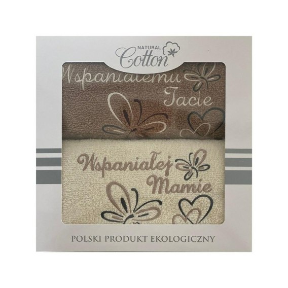 Komplet ręczników w pudełku 2 szt 50x100 Wspaniałej Mamie Wspaniałemu Tacie kremowy beżowy serduszka motylki