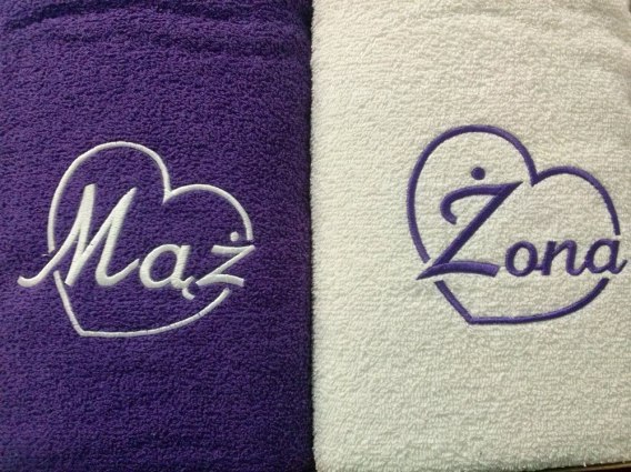 • Komplet ręczników w pudełku 2 szt. 70x140 Mąż Żona Serduszko kremowy fioletowy