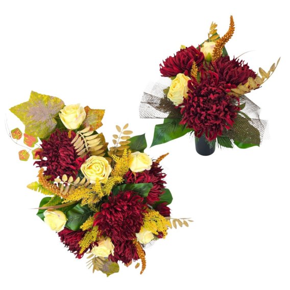 Ten komplet został przygotowany z myślą o spójnej i eleganckiej dekoracji nagrobka. Stroik i bukiet tworzą harmonijną całość, która w piękny sposób podkreśli pamięć o bliskich, zapewniając uroczysty i zadbany wygląd pomnika.