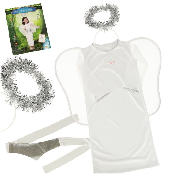Zestaw zawiera długą, białą sukienkę z cekinami, srebrny pasek, opaskę z aureolą na głowę i anielskie skrzydła. Strój jest wykonany z poliestru i zapewnia swobodę ruchów podczas wystąpienia lub zabawy.