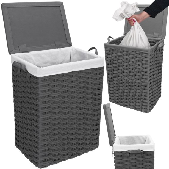 Jest on bardzo ładnym dodatkiem, które dodaje charakteru dekorowanym pomieszczeniom. Produkt jest estetycznie wykonany z plecionego poliestru, a w środku wykończony (wyjmowaną) lnianą wyściółką. Pokrywa posiada elastyczne paski w tym samym kolorze co kosz, służące jako zawiasy.