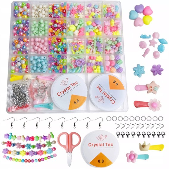 Kreatywny zestaw zawiera mnóstwo elementów, co pozwoli na wykonanie wielu różnych elementów biżuterii takich jak kolczyki, bransoletki czy naszyjniki. W komplecie są także nożyczki, żyłka do nawlekania koralików i różne zapięcia, dzięki czemu zawiera wszystko co potrzebne, aby zacząć tworzyć własne projekty.