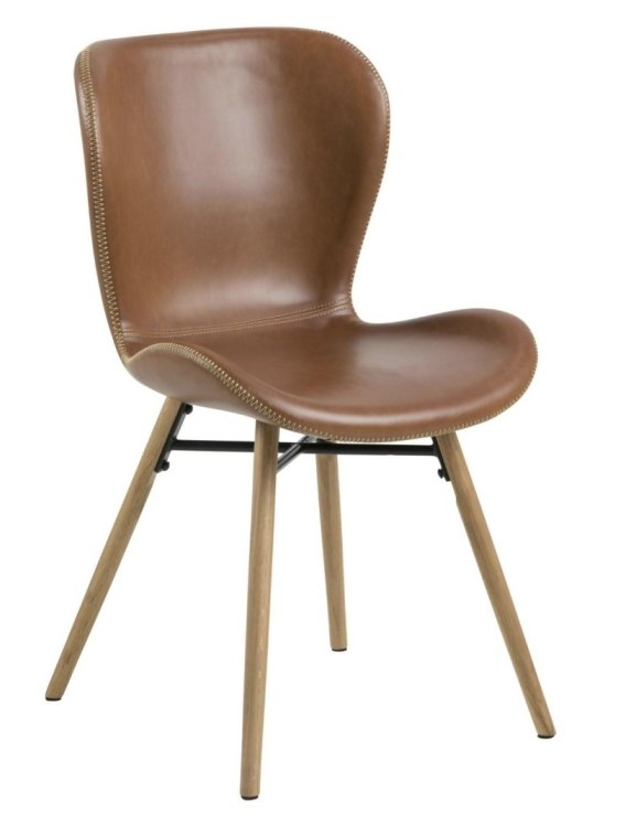 Krzesło Batilda Retro Brandy to doskonałe rozwiązanie do salonu czy jadalni. Solidna podstawa wykonana z olejowanego drewna dębowego, wzmocniona metalowym krzyżakiem zapewni stabilność podczas użytkowania. Siedzisko z eko skóry w kolorze jasno brązowym z grubszym obszyciem wygląda bardzo efektownie. Krzesło jest dośc lekkie, gdyż waży 6,15 kg. Jego maksymalne obciążenie to 120 kg. Maksymalna ilość szt. w pudełku: 2 Wysokość siedziska: 46,5 cm Szerokość siedziska: 47 cm Głębokość siedziska: 40 cm