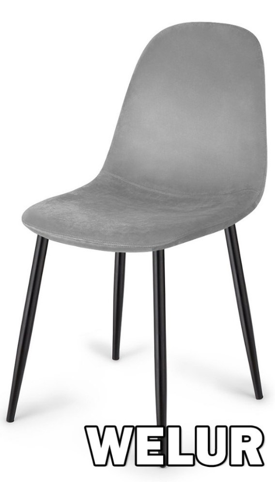 Nowoczesne, solidne i wygodne krzesło do salonu, kuchni, jadalni. Tapicerowane tkaniną welur w kolorze szarym. Czarne metalowe nogi.