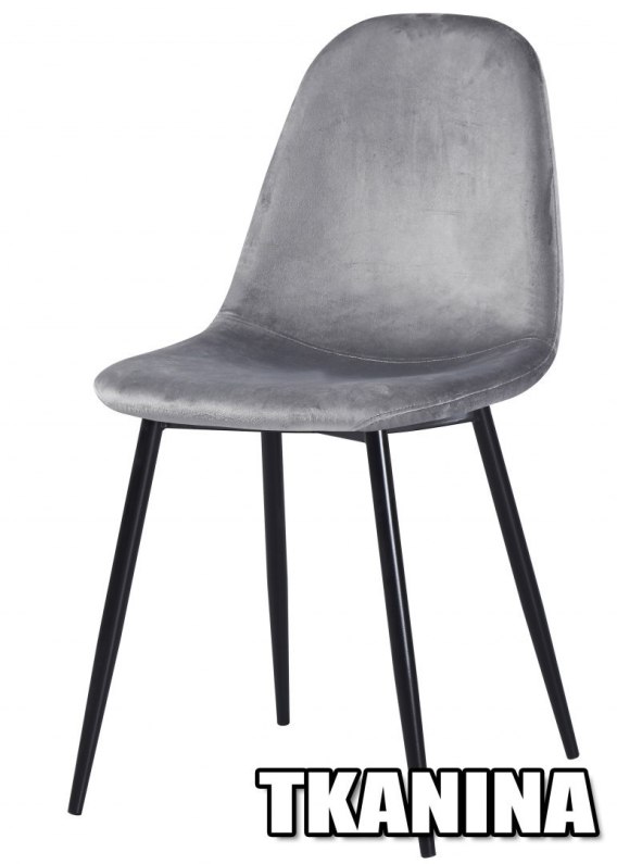 Nowoczesne, solidne i wygodne krzesło do salonu, kuchni, jadalni. Tapicerowane tkaniną welur w kolorze szarym. Czarne metalowe nogi.