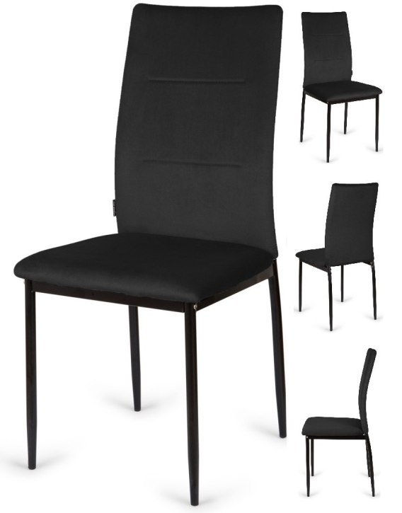 Nowoczesne, solidne i wygodne krzesło do salonu, kuchni, jadalni. Tapicerowane tkaniną welur w kolorze czarnym. Czarne metalowe nogi.