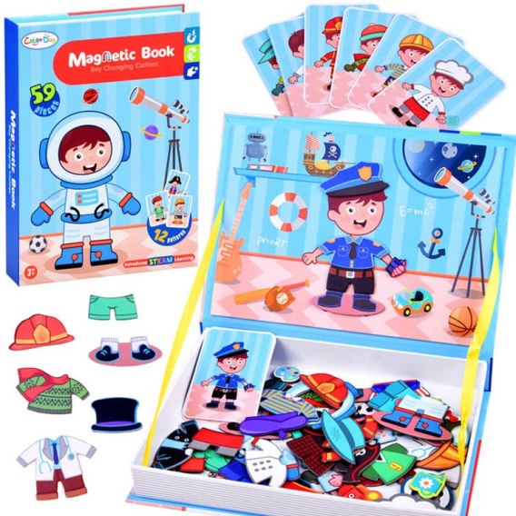 Pudełko zawody męskie to zestaw 59 magnetycznych ubrań oraz akcesoriów do ubrania modela, z którego można stworzyć piłkarza, ogrodnika, budowlańca itp. Fantastyczny kreatywny zestaw zamknięty w twardym, tekturowym pudełku imitującym książkę. Zestaw zawody pozwala dziecku samodzielnie decydować o ubraniu modela, ale także może skorzystać z podpowiedzi kart, na których są chłopcy w dostosowanych strojach do danego zawodu.