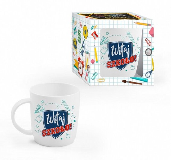 Kubek z porcelany nbc niski o pojemności 330 ml z dekoracją "Witaj Szkoło - tarcza".