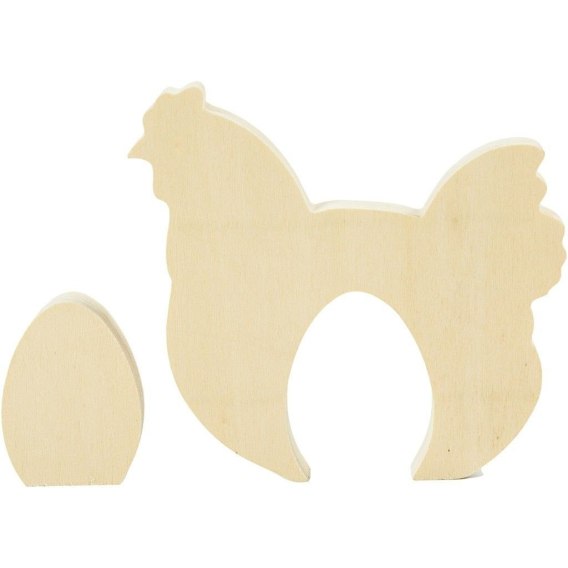 Kura z jajkiem ze sklejki . Jedno w drugim - nowoczesny design połączony z łatwością przechowywania. Idealne do pomalowania farbami akrylowymi, ozdobienia techniką decoupage lub obklejenia masami plastycznymi, papierem, włóczką itp. Wielbiciele naturalnego drewna mogą po prostu postawić na półce i cieszyć się ozdobą mieszkania. Rewelacyjny element wystroju na Wielkanocne spotkanie, jak również urocza wiosenna dekoracja. Nieodpowiednie dla dzieci w wieku poniżej 36 miesięcy. Wymiary kury około: 10x10,5x1,2 cm, wymiary jajka około: 4,5x3,4x1,2 cm. Made in China.
